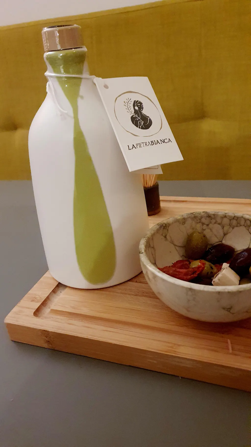 Een handgemaakte stenen fles gevuld met uitzonderlijke extra vergine olijfolie van Il Giardino, een familieboerderij in Puglia die zich inzet voor het beschermen van biodiversiteit door traditionele olijventeelt.